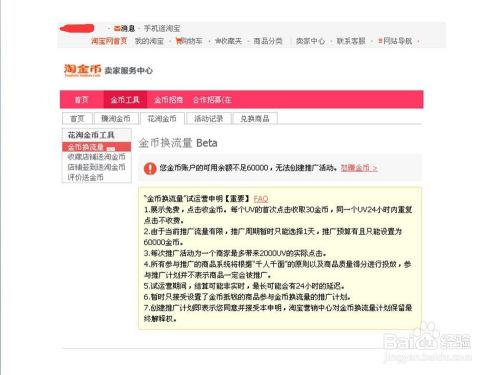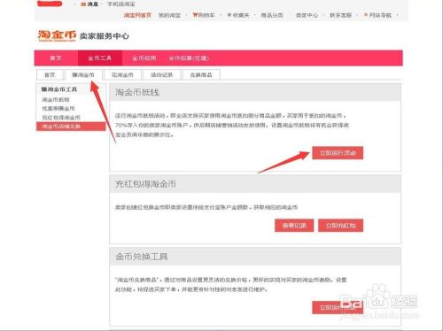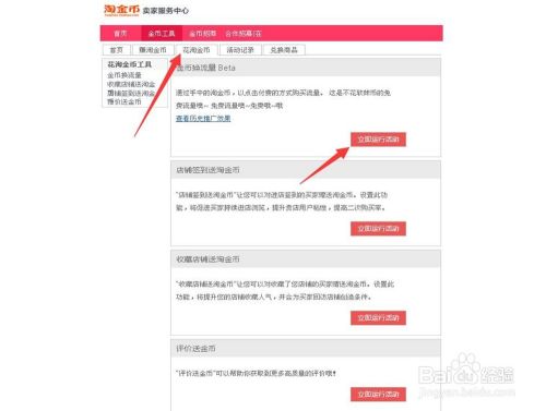 第五,还有金币兑换工具,可以设置给客户用淘金币兑换商品部分金额。操作一样的,这个就省略不说了。有了金币之后就来看怎样设置送金币了。点击“花淘金币”——“金币换流量Beta“——”立即运行活动“