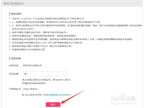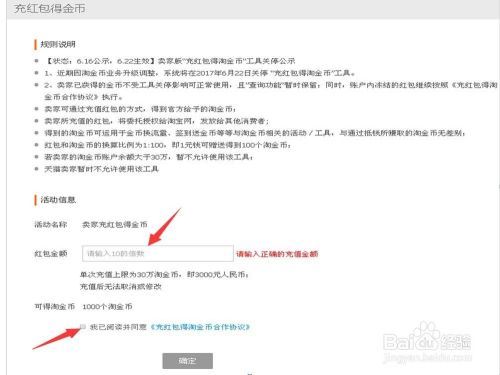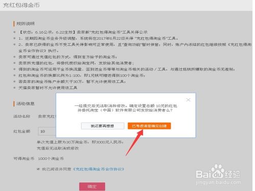 第二,想要设置送客户金币的活动,首先必须有金币,就需要先赚金币。要快速得金币,可点击“赚淘金币——充红包得淘金币——立即充红包”,输入红包金额(1元=100淘金币),勾选”我已阅读并同意……“,再点”确定“,再点”已考虑清楚确定创建“。