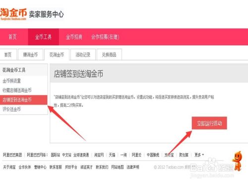 第八,点击”店铺签到送淘金币“——”立即运行活动“,选择开通时间,金币预算,发放范围等,点击”确定开通“
