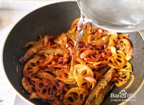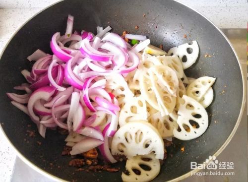 将藕片、洋葱、虾倒入锅中。