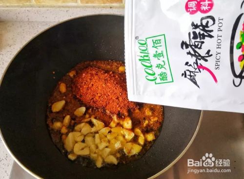 起锅烧油,加入大蒜煸香,倒入调料炒出香味。