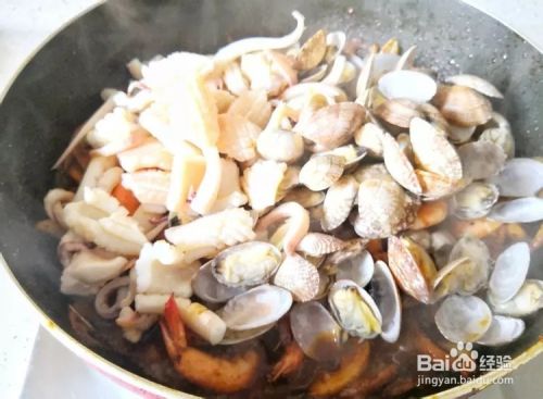 加入鱿鱼和花蛤翻炒均匀,加入芹菜