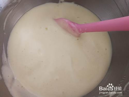 翻拌匀后再倒回蛋白盆中,翻拌或切拌均匀。记住:一定不要画圈拌,以防消泡,影响起高。要注意手法,这是成败的关键。