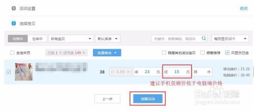 选择宝贝,设置手机专享价(建议手机专享促销价低于电脑端价格),点击创建活动。