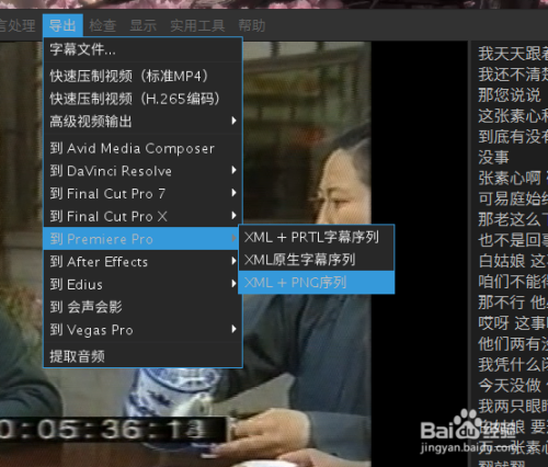 接着我们点击主页面上面的“快速拖拽工具”就可以将字幕和视频进行匹配如果我们要文件导出到pr我们点击上方的导出在里面选择Premiere Pro下面的XML+PNG序列