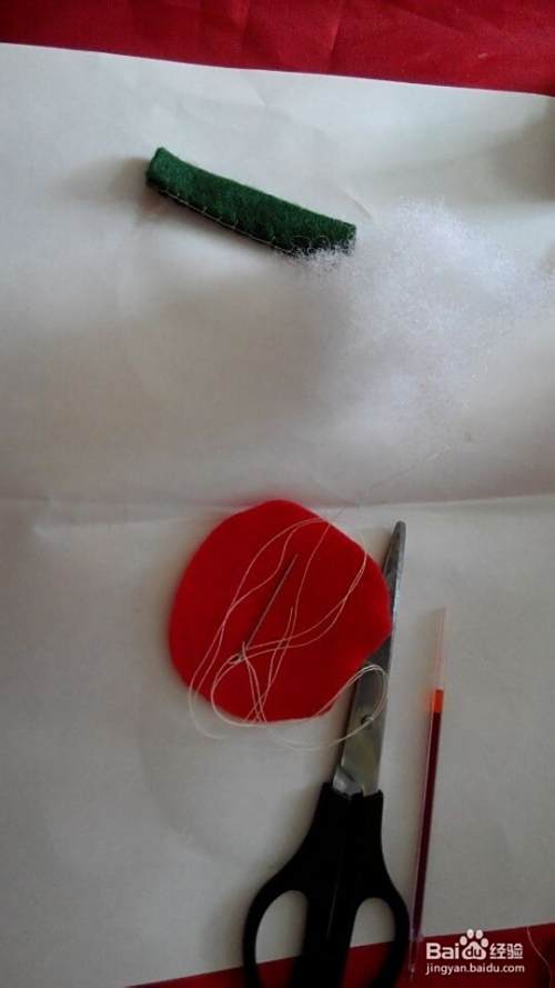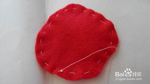 在红色不织布上用笔画上一个圆形,然后用剪刀剪下来。