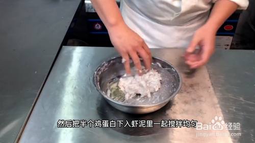 先把虾仁开背去除虾线,然后用刀背把虾仁拍成泥状,然后给拍好的虾仁加入少许的盐,再用刀背敲打虾泥,再把剁好的虾泥放在碗里备用。