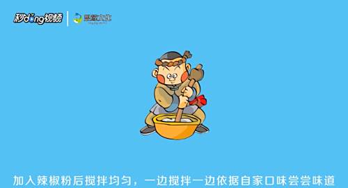 4加入辣椒粉后搅拌均匀,一边搅拌一边依据自家口味尝尝味道。