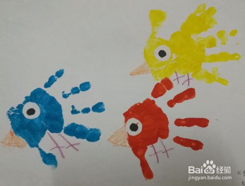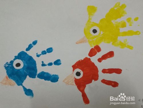 印好的小手掌看起像小鸟的身体,有翅膀,尾巴,那就给它添上圆圆的小眼睛,