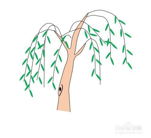 在柳枝上面,左右错落的画出柳树的叶子,把叶子画的狭长一些,采用绿色上色。