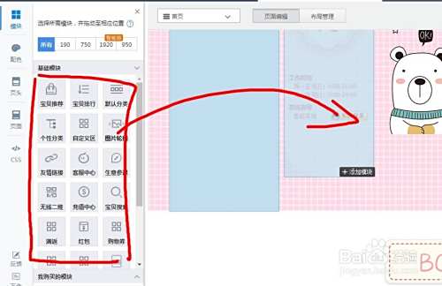 模板的模块可以添加删除,模板里面的模块可以拖到右边布局里,当显示黄色描边或虚线时松开鼠标即可添加进去,“布局管理”和“页面编辑”模式下都操作添加