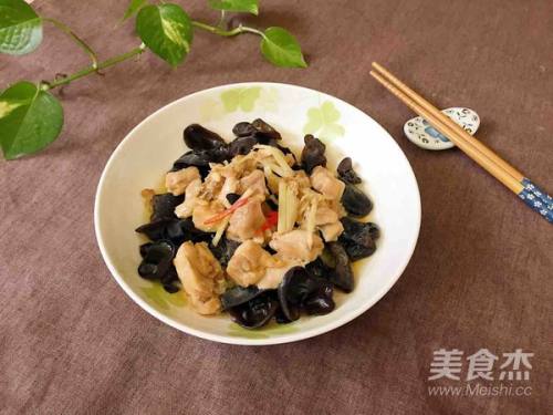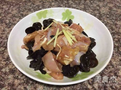 5木耳放到鸡肉下面,表面放上姜丝。