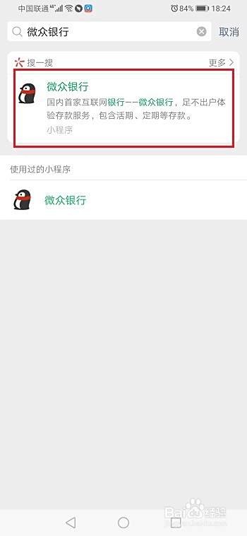 第一步微信每年限额20万超过了,还可以开通微众银行,可以使20万额度提升到50万额度,打开微信,搜索微众银行,如下图所示: