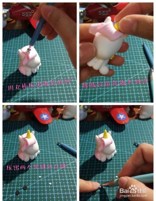黄色的粘土捏个小角,然后把小角处理一下,拼接到独角兽的头上。