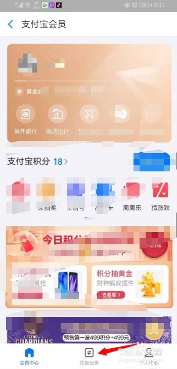在支付宝会员页面,点击页面下方中间的兑换记录。