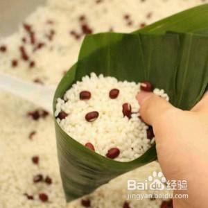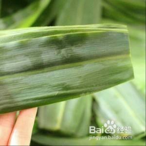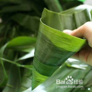 三片粽叶正面朝上,每片少许重合平行叠放(我的粽叶较小,大粽叶可用两片),卷起呈漏斗状。