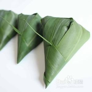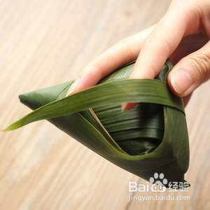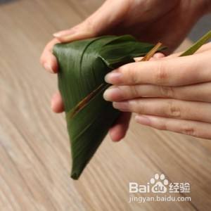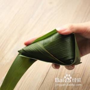 再取一片粽叶,去叶柄那端对准粽子尖,从侧面包裹粽子。