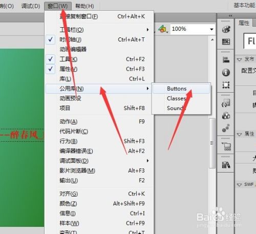 在这里我们需要两个按钮,一个用来设置跳转到下一页,一个用来设置跳转到上一页,为了方便,我们从flash的公用库里面调用两个预设好的按钮。