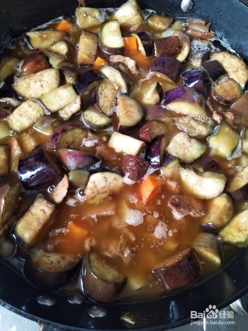 放入茄块翻炒均匀,加入料酒,酱料,十三香,生抽调味