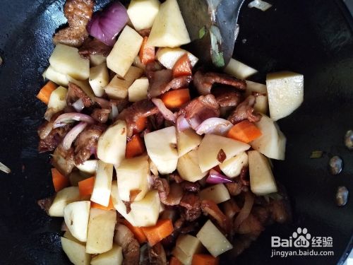 放入洋葱,土豆及胡萝卜块翻炒