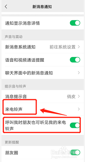 进入到新消息通知页面,将呼叫我的朋友可听见我的来电铃声的开关打开,并点击来电铃声。