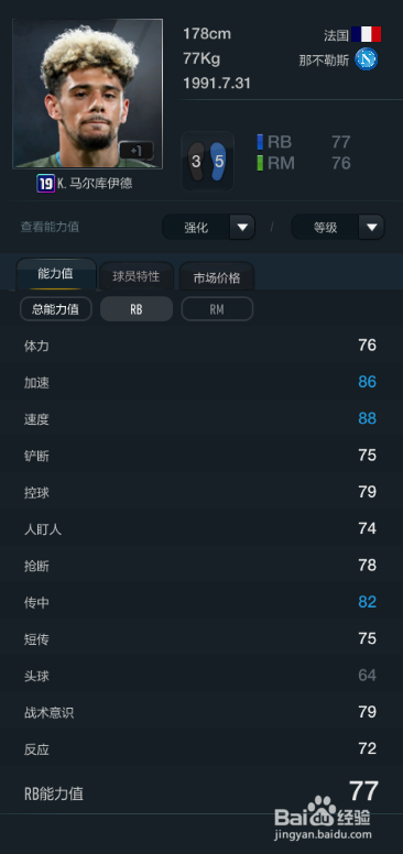 右后卫——凯文-马尔库伊德(19欧冠联赛):马尔库伊德出自摩纳哥的青训营,2010年升入一线队,之后效力球队两个赛季,是球队的主力边后卫,在游戏中马尔库伊德的双速非常快,突破能力还是不错的,传中准确,同时他的抢断能力也是很不错的,是一名合格的主力边后卫。