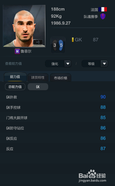门将——鲁菲尔(队魂赛季):鲁菲尔2004年就来到了摩纳哥的青训营,2006年升入一线队,效力球队五个赛季,之后逐渐成为了球队的主力门将,鲁菲尔扑远射的能力不俗,在场上失误也很少,游戏中的鲁菲尔也是出色的球员,他的反应很迅速,而且扑救能力也是很出色的,做为主力门将是没有问题的。