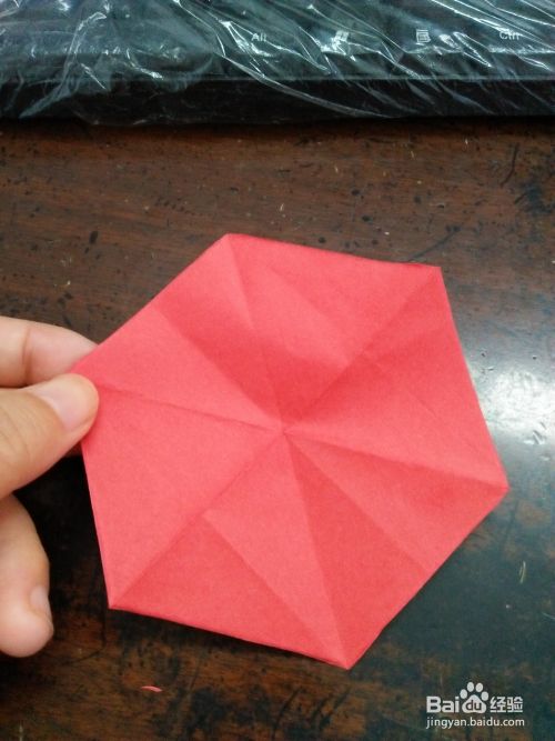 打开后是个六边形,我们把所有的中线全部对折一遍。按照折痕把六边形向内折出现个三角形。