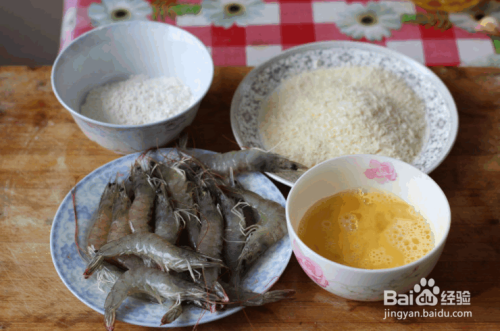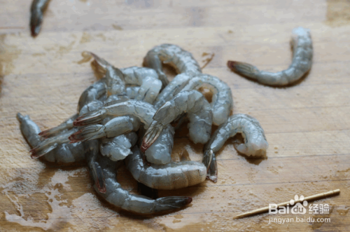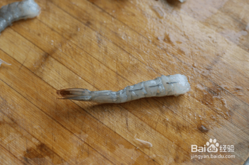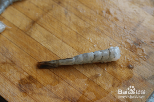 把虾去头,用牙签在背部前两节处挑出筋,然后剥去壳,留下尾部的一节不剥。