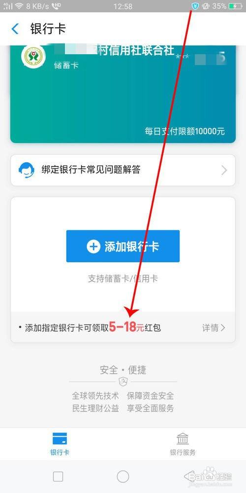 5、最后绑定银行卡,这样就可以免费获得现在红包了。如下图所示。