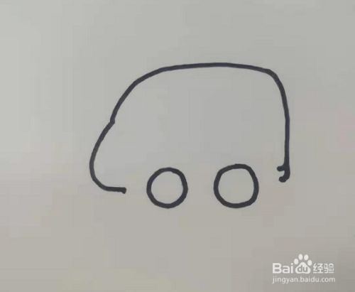 第三步,这里我们要画出救护车的轮子,在刚刚画好的图形的下面部分,画上两个并排的小圆圈,小圆圈要在一条水平线上,大小要差不多,如下图所示。