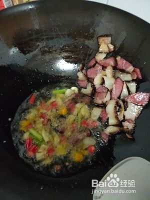 锅里放入适量油,下腊肉小火煎制腊肉呈透明状放入大蒜,小米椒爆香。。