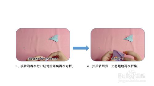 接着沿着在把已经对折两角再次对折,并反转到另一边将翅膀再次折叠。