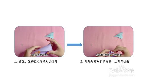 首先,先将正方形纸对折摊开,然后沿着对折的线将一边两角折叠