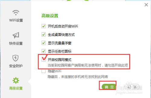 在高级设置中,找到开启校园网模式,将前面的的方框中打上对勾,点击确定,重启WiFi即可