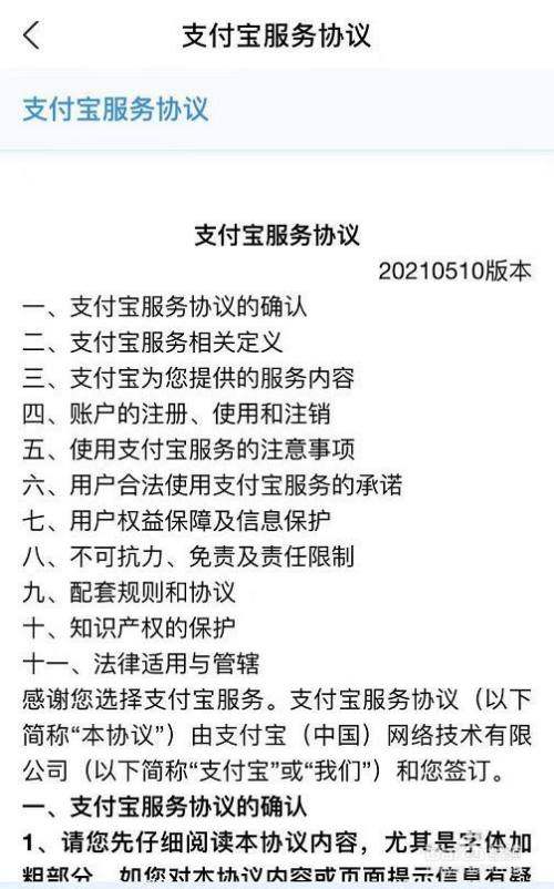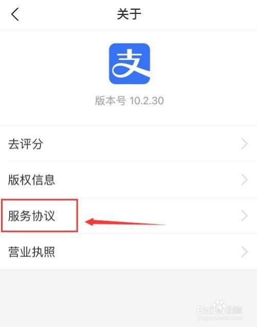 在关于界面,点击【服务协议】即可看到支付宝服务协议内容。