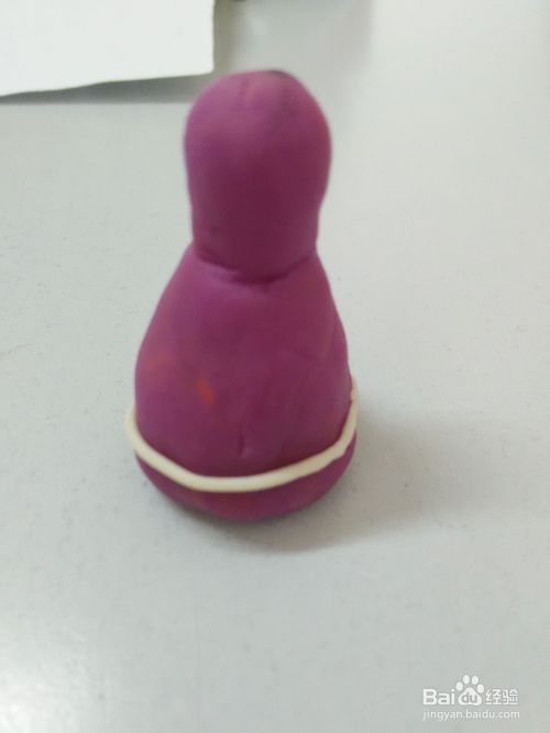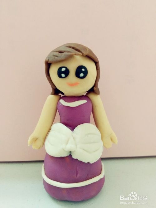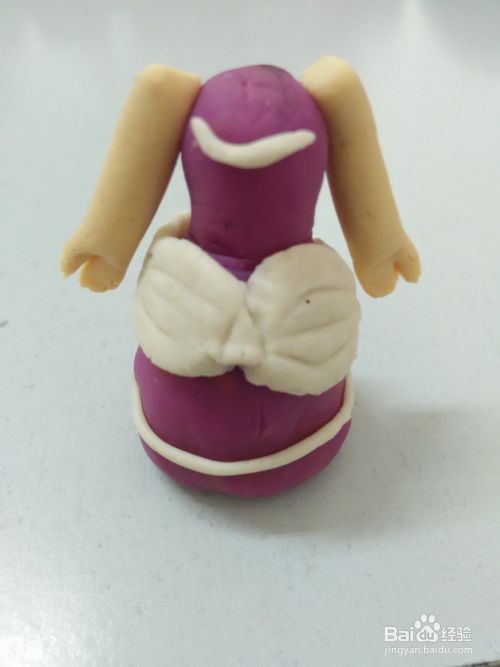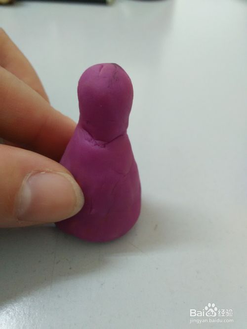 下面做裙子,用紫色搓成长圆条,放在桌上,上面三分之一处,搓细,下面搓成喇叭状的公主裙。