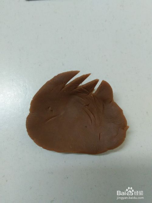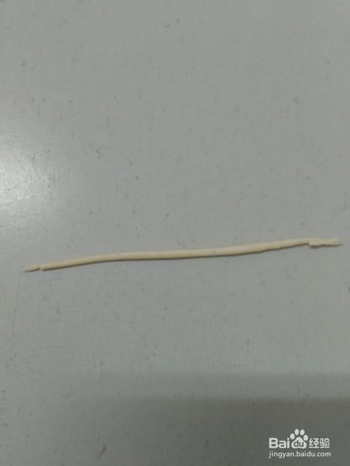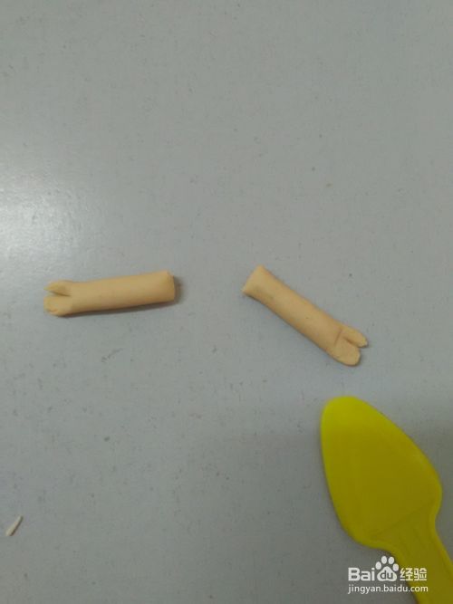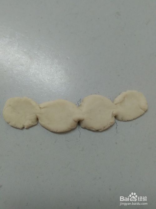 再搓一条粗一点的白色长条,然后按扁,用手指甲掐出三段小节,形成四个圆片。