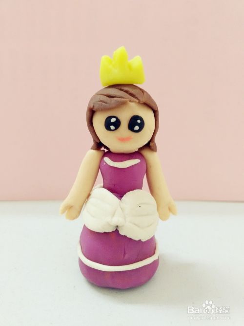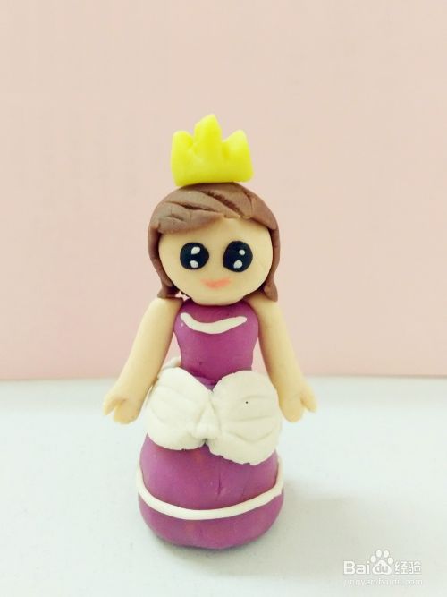 用黄色搓成小方块,用小刀在上面刻两刀,刻出三个尖尖的部分,做成一顶王冠。把王冠粘在小公主头顶上,一个真正的小公主就诞生了。