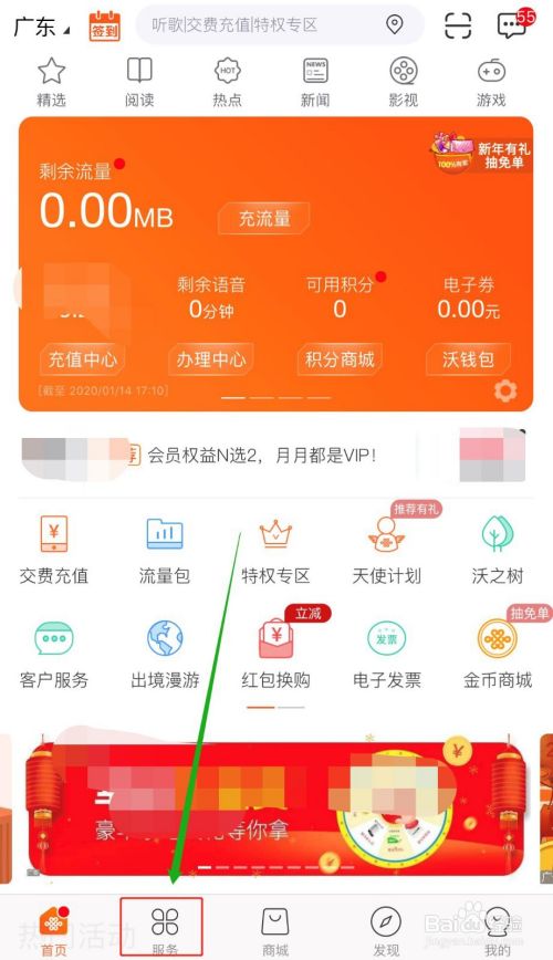 打开并登录中国联通手机营业厅客户端,点击下方【服务】;