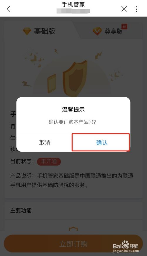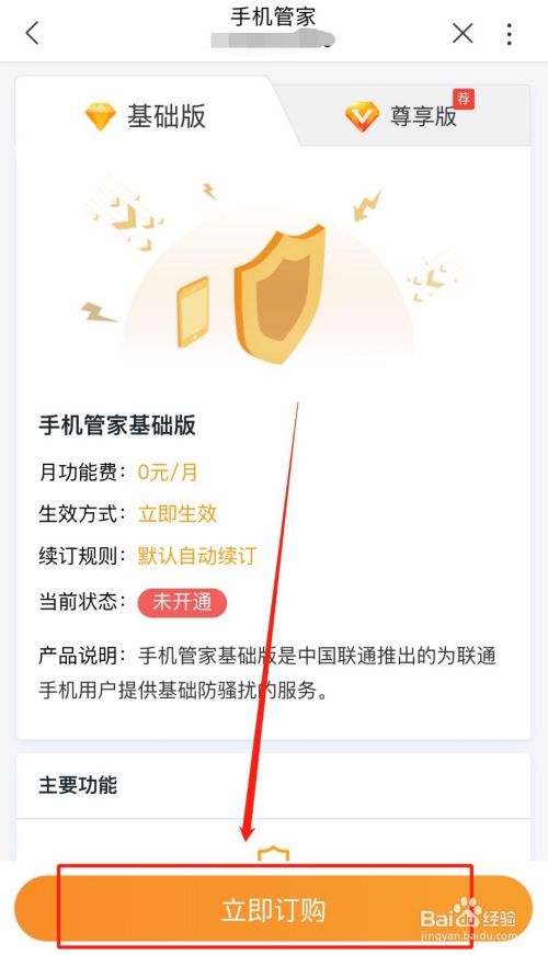 进入“手机管家”办理页面,选择【基础版】或【尊享版】,点击【立即订购】;