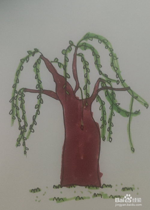 在每个六条上面画出若干的柳叶和柳芽,并在土地位置画出小草。。