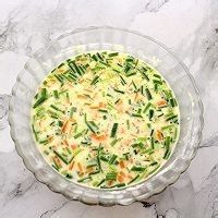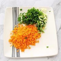 胡萝卜洗净,用刮刀刮去外皮切末,越细越好;香葱摘除腐叶,洗干净切末。