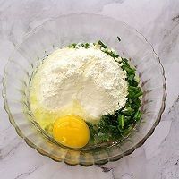 面粉倒入大碗中,倒入切好的胡萝卜碎,香葱碎,打入一个生鸡蛋。