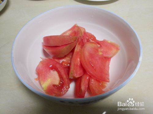 将西红柿洗净切成片,将切好的西红柿放入大碗中。