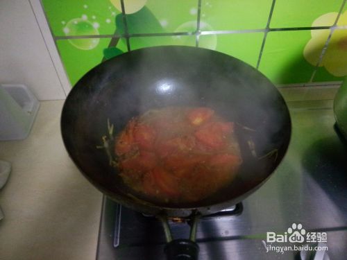 将炒锅刷净,放在炉灶上,打开燃气开关,等锅内水干后,加入适量花生油,油热后加花椒、姜末、葱丝爆香,然后放入西红柿翻炒,将西红柿炒成糊状。