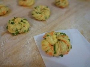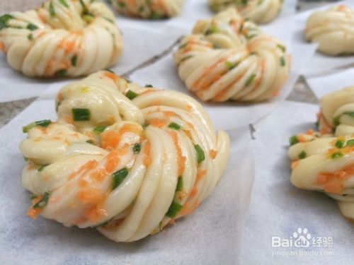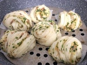 面团排气。面皮涂薄油,撒少许盐和葱花,整形,放锅里静置发酵