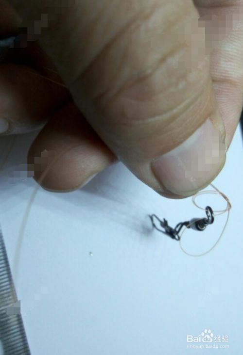 将主线长端和子线没有鱼钩的一端在线圈中穿过三到四次并拉紧,剪掉多余的子线线头。节点与主线短端距离20cm。将主线与子线绕一个圈,将主线长端与子线非鱼钩端穿过线圈三到四次,拉紧。