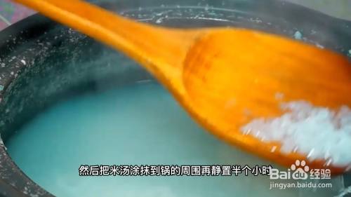 再放入一勺大米加水将它熬制,然后把米汤涂抹到锅的周围再静置半个小时。