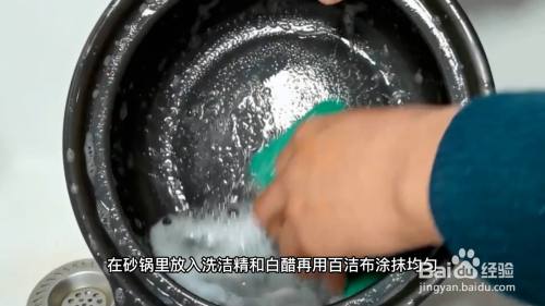 在砂锅里放入洗洁精和白醋再用百洁布涂抹均匀,接着用清水洗干净并擦干水分。